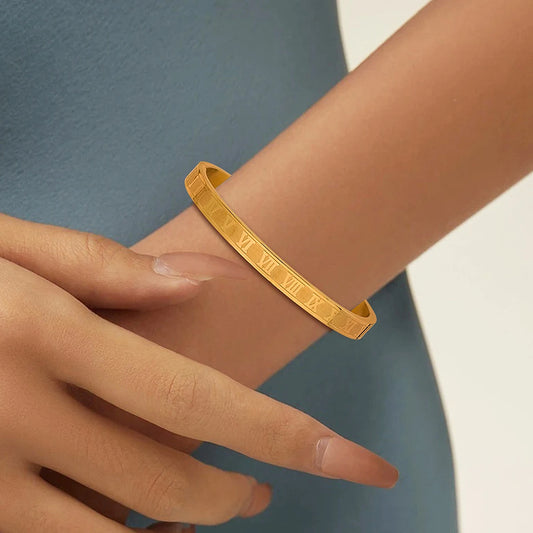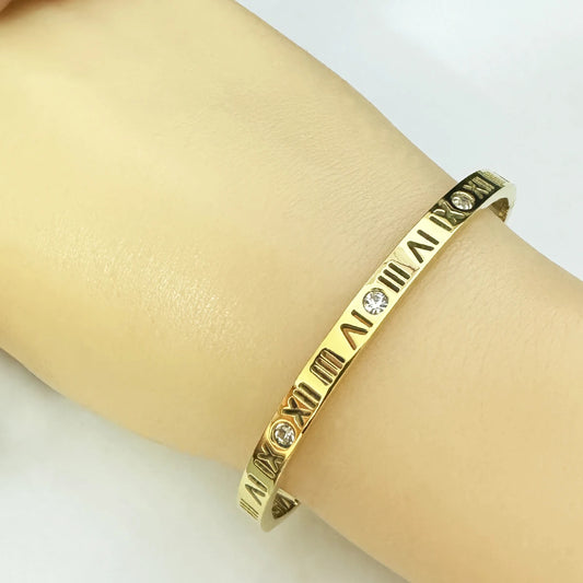 Regular price $154.70 AUDRegular priceUnit price / per$232.70 AUDSale price $154.70 AUDSold outRoman Numeral Crystal Gold-Plated Stainless Steel Bangle